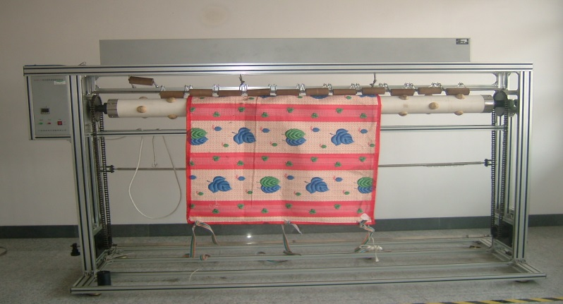 结构及功能:该设备采用电机驱动,达到试验次数自动停机。试验时将电热垫一端固定在设备的驱动装置上,驱动装置带动电热垫以125mm/s水平往复运动,电热垫铺在直径Φ25mm的滚轴上,末端挂0.5kg砝码或者3g/mm的负荷力,运行2000个周期,然后将试样旋转90°夹持,再进行2000个周期试验。